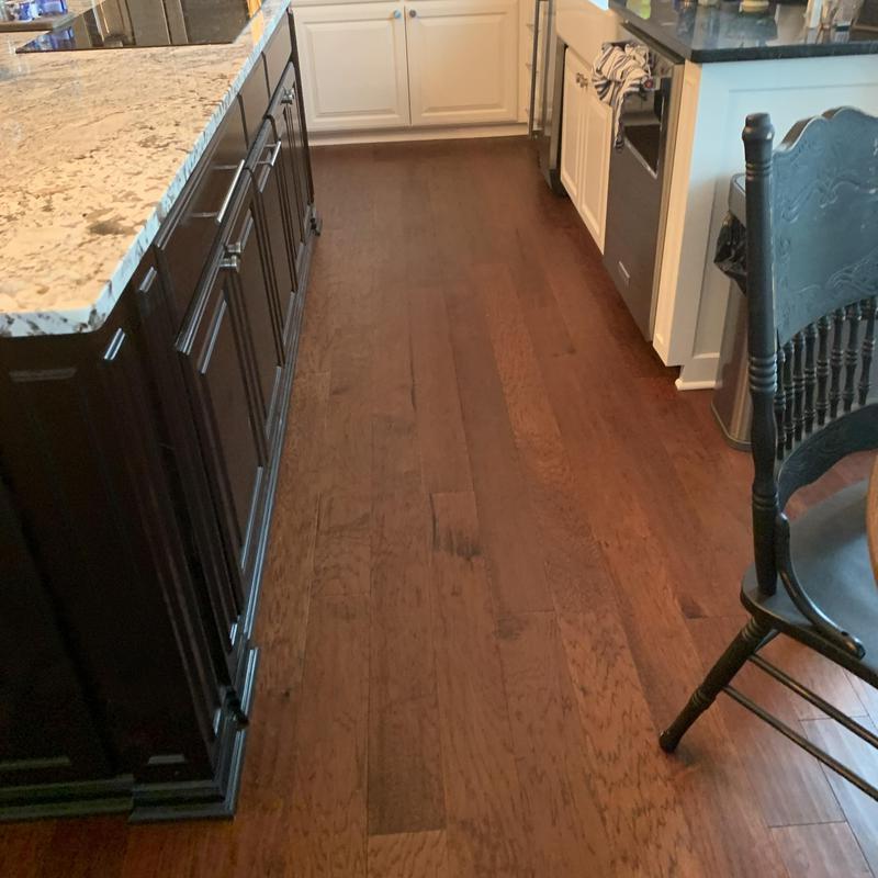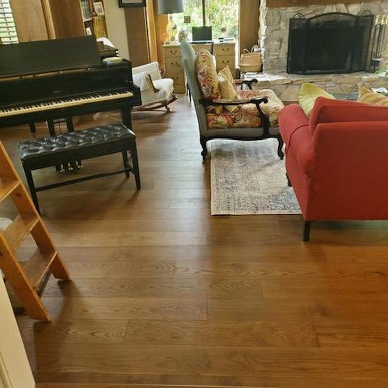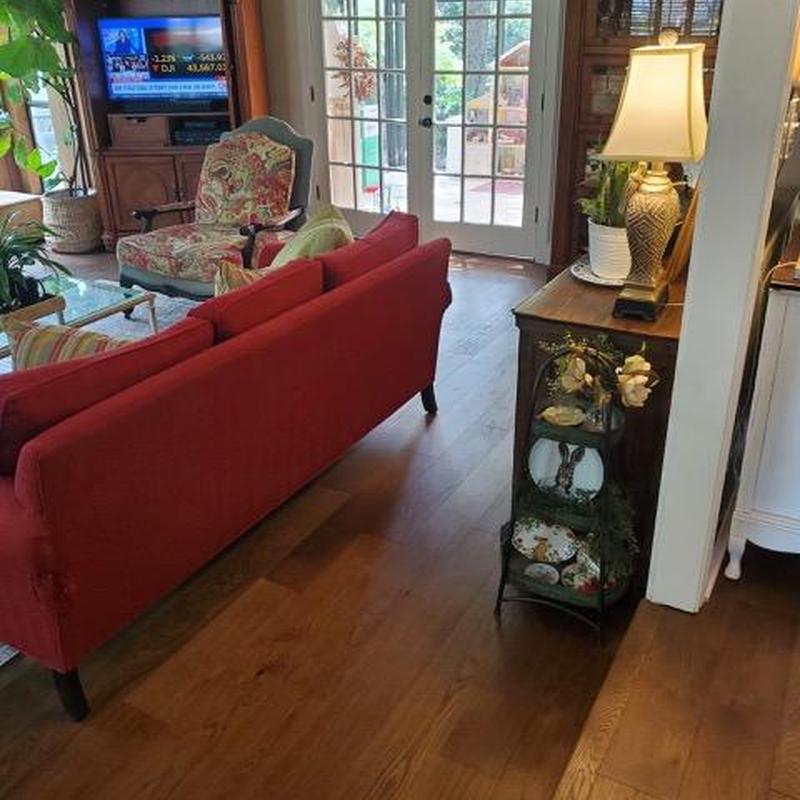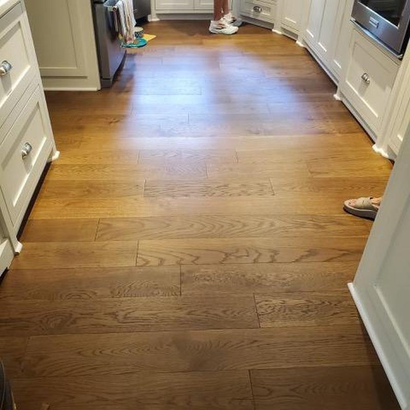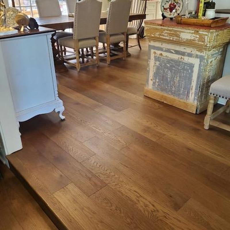 DFW Flooring Warehouse installed wood flooring in the kitchen and family room of a home in Fort Worth, Texas. The team added matching hardwood to expand the existing flooring layout, creating a consistent surface across both spaces.