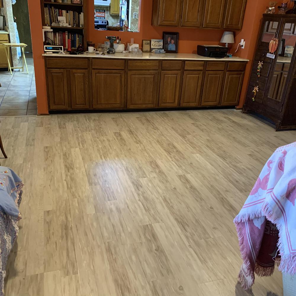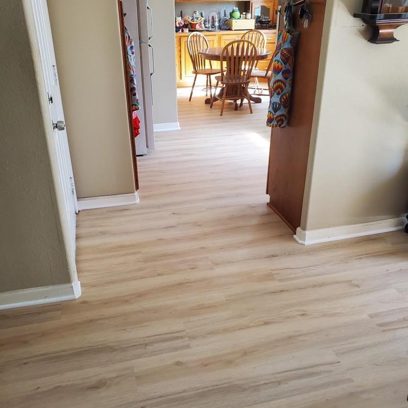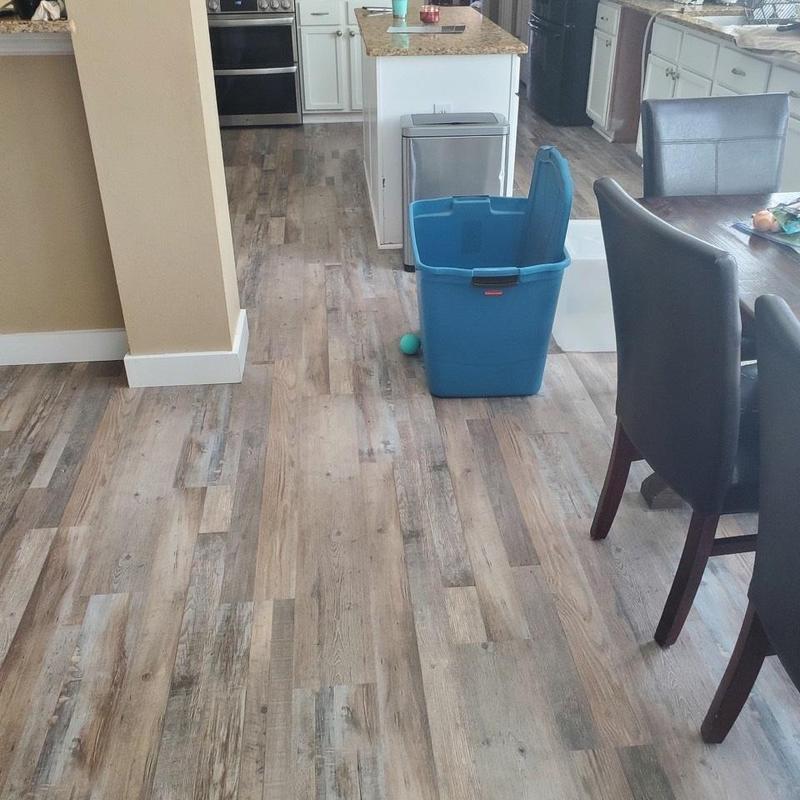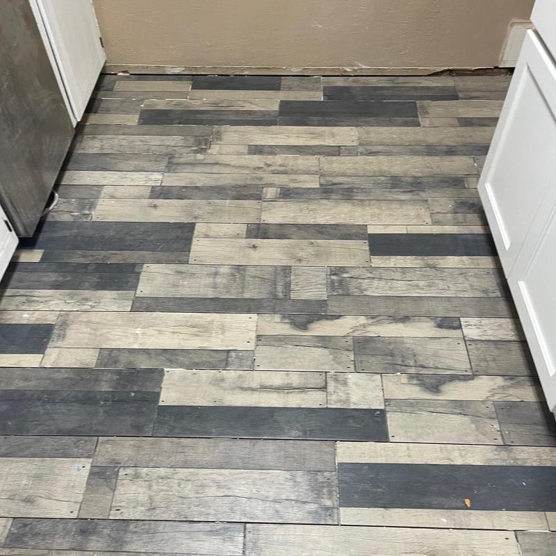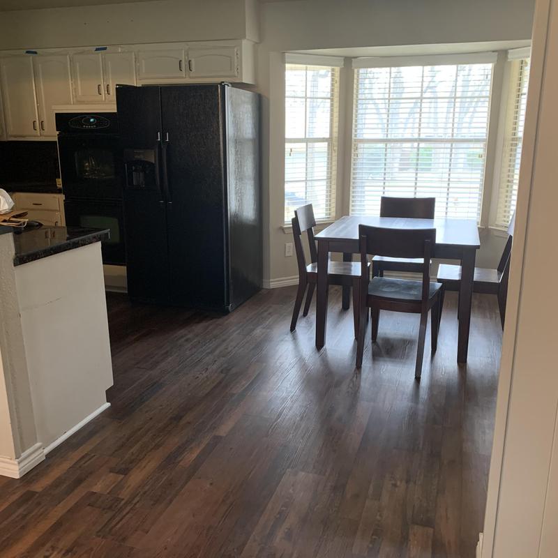 DFW Flooring Warehouse completed a vinyl flooring installation project in Arlington, Texas. The service included removing old roll vinyl, preparing the area, installing new roll vinyl in the kitchen and dining area, adding white shoe molding, and disposing of the old flooring.