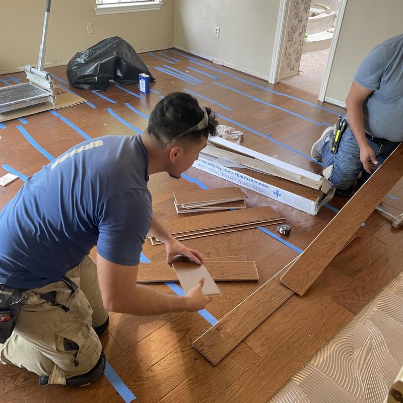 DFW Flooring Warehouse installed new wood flooring in three bedrooms and repaired water-damaged wood in a hallway. This project took place in Arlington, Texas. The team removed damaged sections and matched the repairs to the existing floor for a consistent finish.