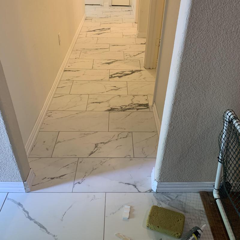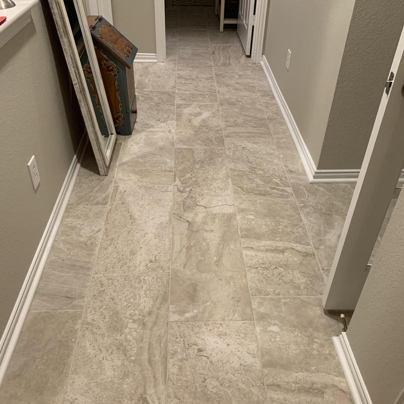 DFW Flooring Warehouse installed marble-look porcelain tile in the entry, hallway, bathroom, and laundry room of a home in Arlington, Texas. The project used durable tile to create a consistent surface across multiple interior spaces. This flooring choice offers a seamless appearance with easy maintenance.