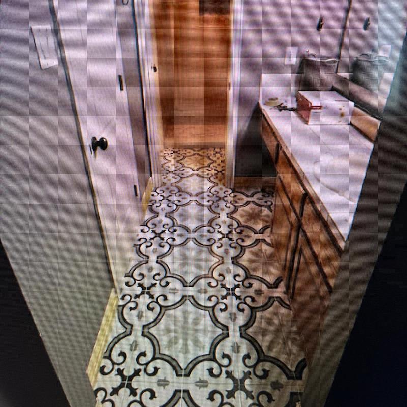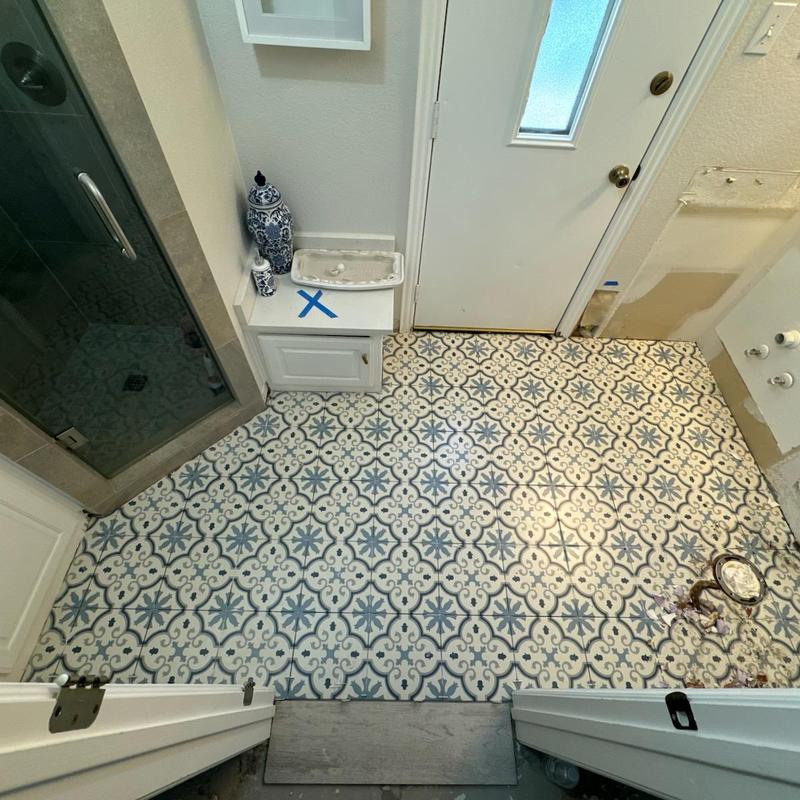 DFW Flooring Warehouse installed 8x48 Weathered Spring flooring and 10x10 Montecarlo Blue Patterned tiles in bathrooms and a laundry room in Arlington, Texas. This service combined durable flooring with stylish tile patterns for cohesive results.