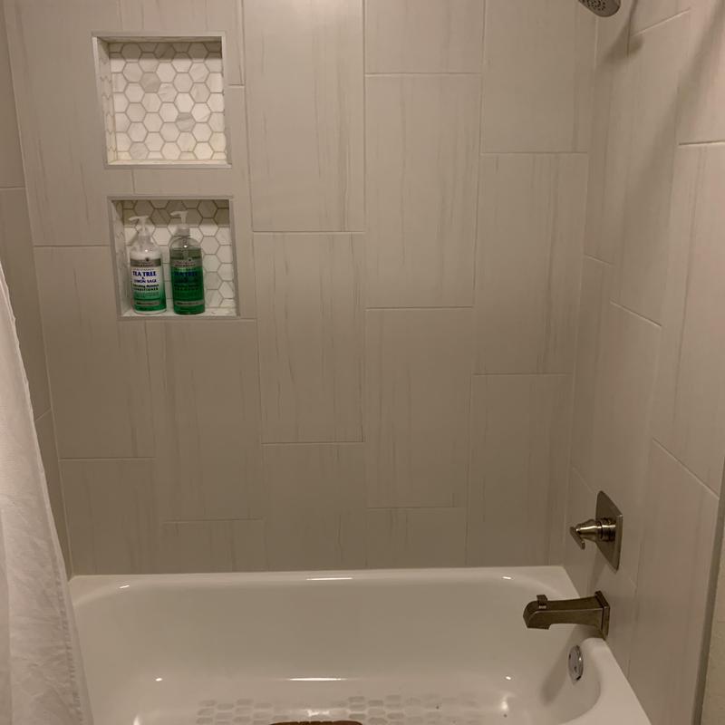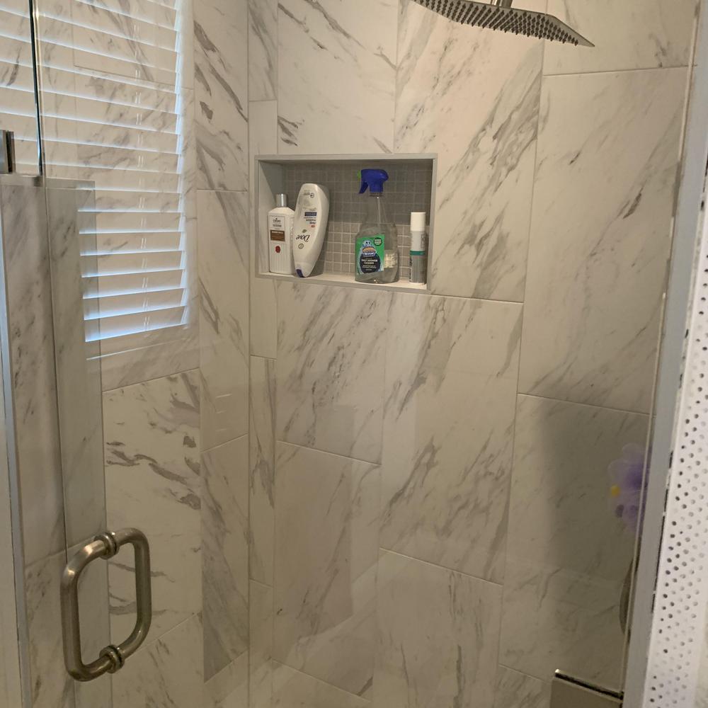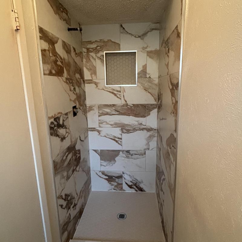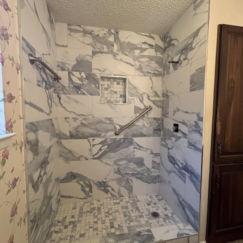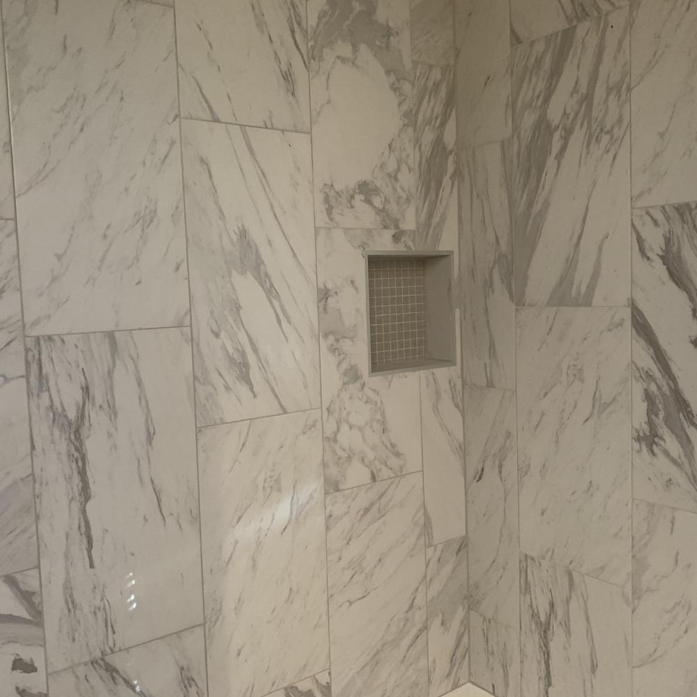 Installed 12x24 Happy Floors marbleized wall tile in Arlington, TX. This tile provides a durable and visually appealing surface for bathrooms, kitchens, and other interior spaces. Precise installation ensures a secure fit and long-lasting performance.