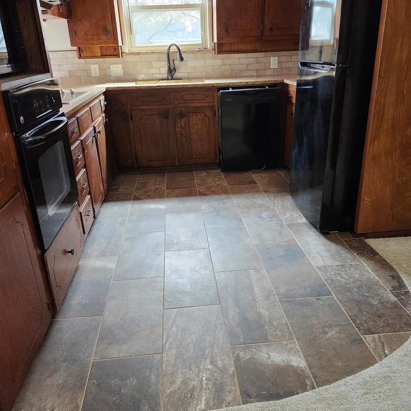 Replaced Saltillo tile flooring with 12x24 Dal Tile Slate Attache porcelain tile and installed an Amazonia 3x8 porcelain tile backsplash in the kitchen. The update improves durability and complements the space with a clean, modern look. Project completed in Arlington, TX.