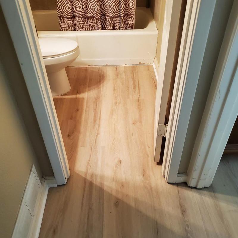 DFW Flooring Warehouse installed new flooring in an upstairs kitchen, utility area, bathroom, and closet in Arlington, TX. The team placed flooring over the existing surface, added white shoe molding, installed an end cap at a carpet transition, and reset the toilet with a new wax ring.