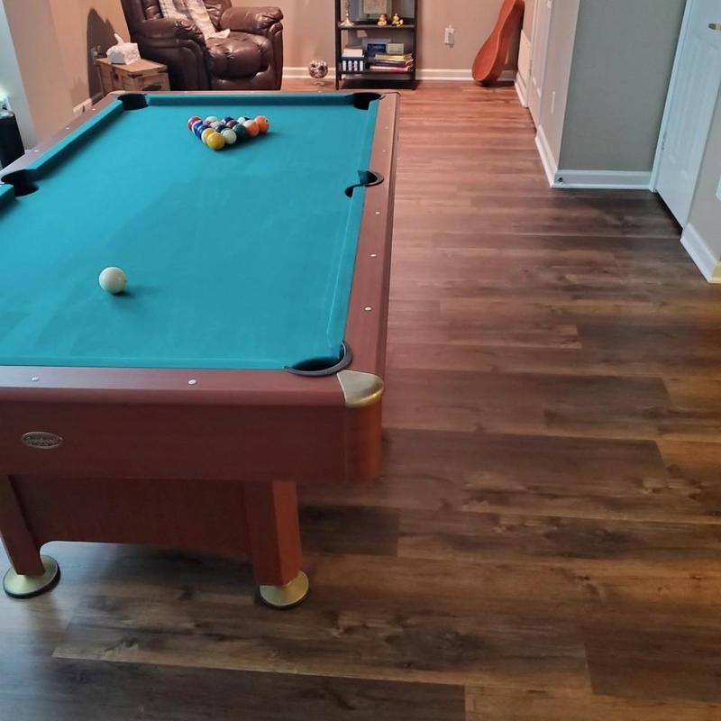 DFW Flooring Warehouse completed a full flooring installation in Arlington, Texas. The team removed old flooring and baseboards, moved furniture and appliances, and installed new flooring throughout the downstairs and one upstairs bathroom. They reinstalled three toilets and a pedestal sink, installed baseboards provided by the customer, and applied caulk for a finished look.