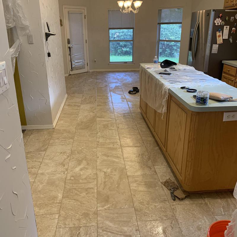 DFW Flooring Warehouse replaced water-damaged laminate with porcelain tile in the kitchen and dining room of a home in Arlington, Texas. The project improved surface durability and provided a more water-resistant flooring option for high-use areas.