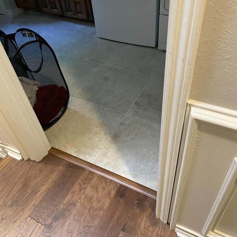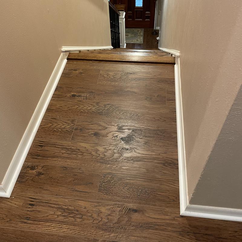 DFW Flooring Warehouse replaced wood and tile flooring in a kitchen, hallway, entry, and hall bathroom in Arlington, TX. The team removed old materials, ground the floor, moved a fridge, and reinstalled a toilet and pedestal sink. They also installed new baseboards, shoe molding, and transition pieces for a complete update.